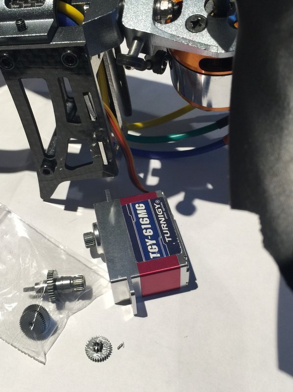 В новой сервомашине поломался металлический редуктор, рассчитаный на 6кг усилие (не мудрено с учётом размера винтов и динамической нагрузке при ударе об землю), я заказал ремкомплект и сижу, думаю как вкорне переделать хвостовой механизм.